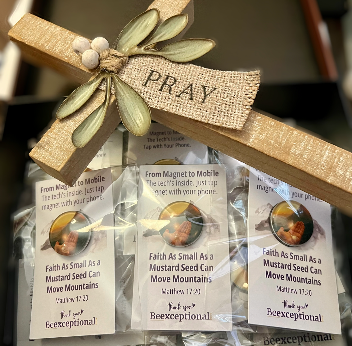 Each magnet holds a real mustard seed. Tap it with your phone to open a link with scripture, prayer, and encouragement.